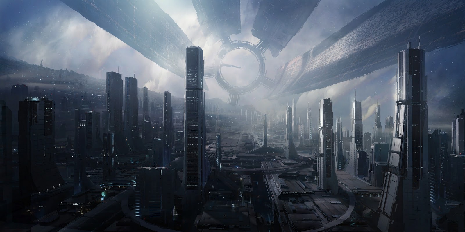 I could talk about the Citadel for days. It's such an impressive and beautiful thing. It represents the center of galactic stability and balance - the yin and yang of the known universe. All civilized alien races come to the Citadel; many live there in various wards, some of which are considered the slums where there are higher crime rates. The attack on the Citadel at the end of ME1 caused a lot of damage, but didn't destroy it. Efforts have been made to rebuild it, and much of it has been restored by the time FemShep revisits it. Here's one of my favorite images that shows the detail and massive size of it. There are five "wings", and there are large, apportioned wards on each wing. Every human on earth could live on the Citadel and might not even fill one wing. It's astronomically huge and astounding.